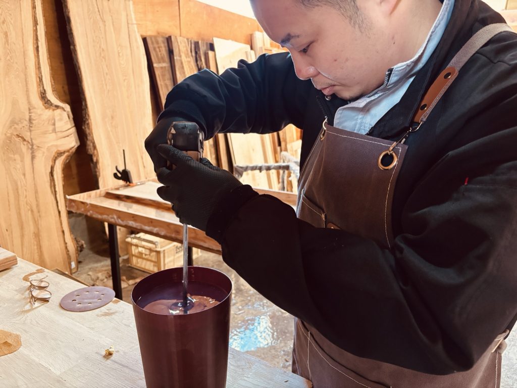 表面を滑らかにし、光沢を出すためには、段階的に細かい研磨材を使用し、丁寧に磨き上げる必要があります。このプロセスを通じて、木材とレジンの美しい融合がさらに際立ち、唯一無二の作品が完成します。