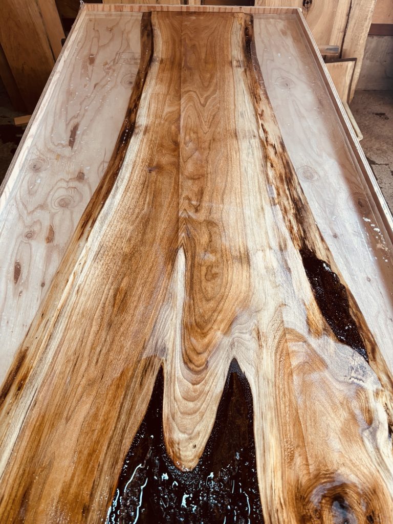 本日、エコロキアのレジンテーブル制作体験ワークショップ第2回目が開催されました。前回、グレイッシュなトーンが美しいクルミ材を選ばれた参加者の方が、今回はクリアレジンの流し込み作業に挑戦されました。