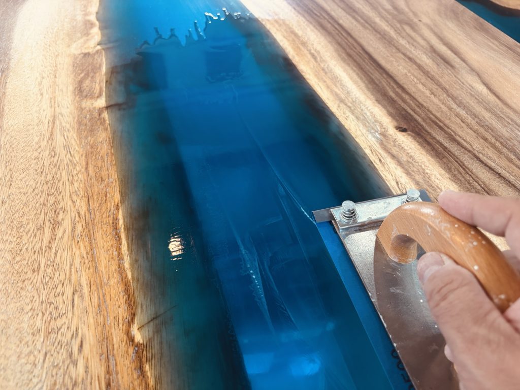今週末に納品予定のフルオーダーのモンキーポッドにブルーのレジンを組み合わせたダイニングテーブル、その最終仕上げを行うにあたり、僕は決意しました。
