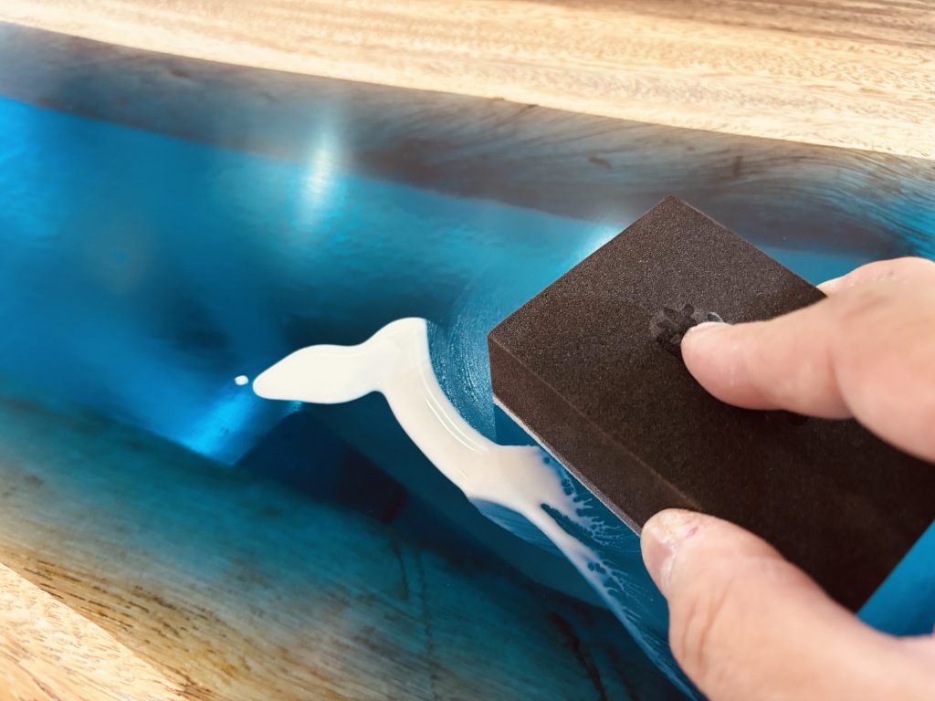 レジンテーブルの仕上げは、丁寧に研磨を重ねるほど透明感が増していくのです。これは電動サンダーではなかなか味わえない感覚で、手作業ならではの「達成感」があります。