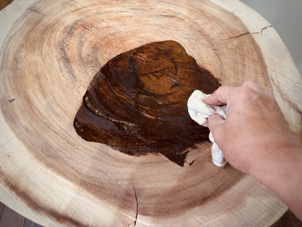 厚み約50mm、直径500〜700mmほどのモンキーポッドの丸太の輪切り。この素材をじっくりと磨き上げ、自分だけのサイドテーブルを作り上げる体験は、他にはない贅沢なひとときです。