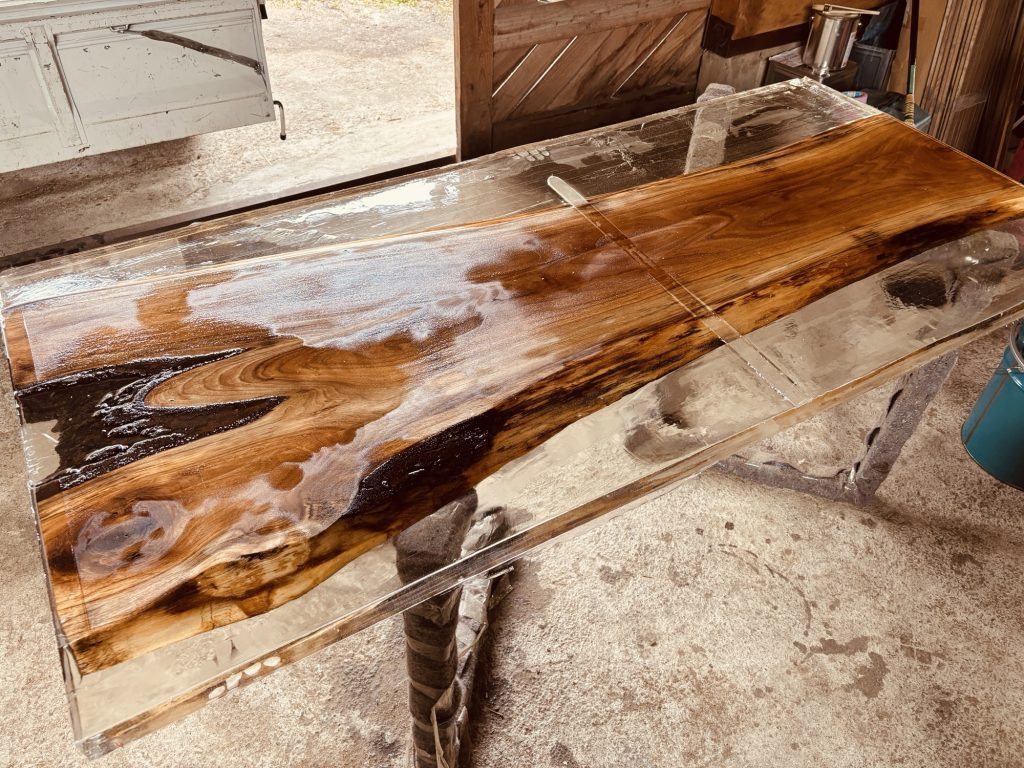 今回も慎重に型枠を取り外し、無事にレジンとクルミ材が一体化した天板が姿を現しました。