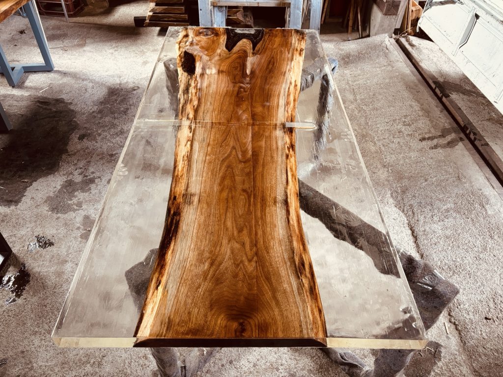 今回のワークショップで制作したクルミ材×クリアレジンのダイニングテーブル は、着実に完成へと近づいています。