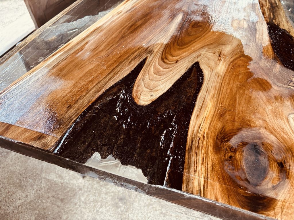 今回はクルミ材を使用し、透明なレジンをたっぷりと流し込みました。クリアレジンは木目を引き立て、まるでガラスのような仕上がり になります。