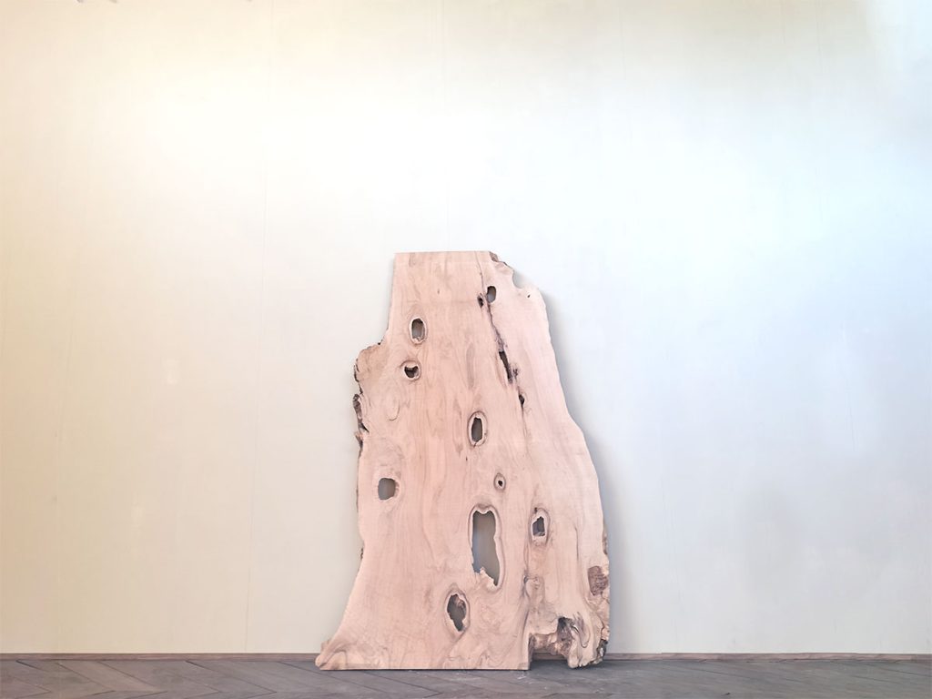 オリーブの木は、長い年月をかけて複雑に成長するため、自然が生み出した唯一無二の形状を持っています。特に今回の一枚は、大小さまざまな穴が開いており、これをどう活かすかがデザインのポイントになります。