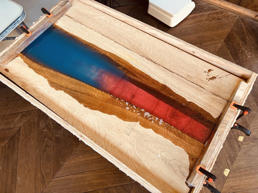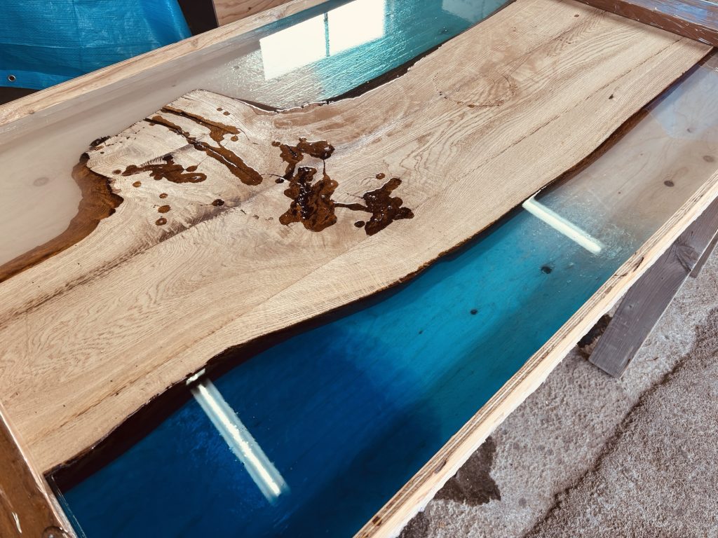 次回は、硬化したレジンを研磨し、表面を滑らかに仕上げる工程に入ります。この研磨によって、よりクリアで美しい仕上がりになり、テーブルの透明感が際立ちます!また、エッジ部分の仕上げや最終的なコーティング処理も行う予定です。