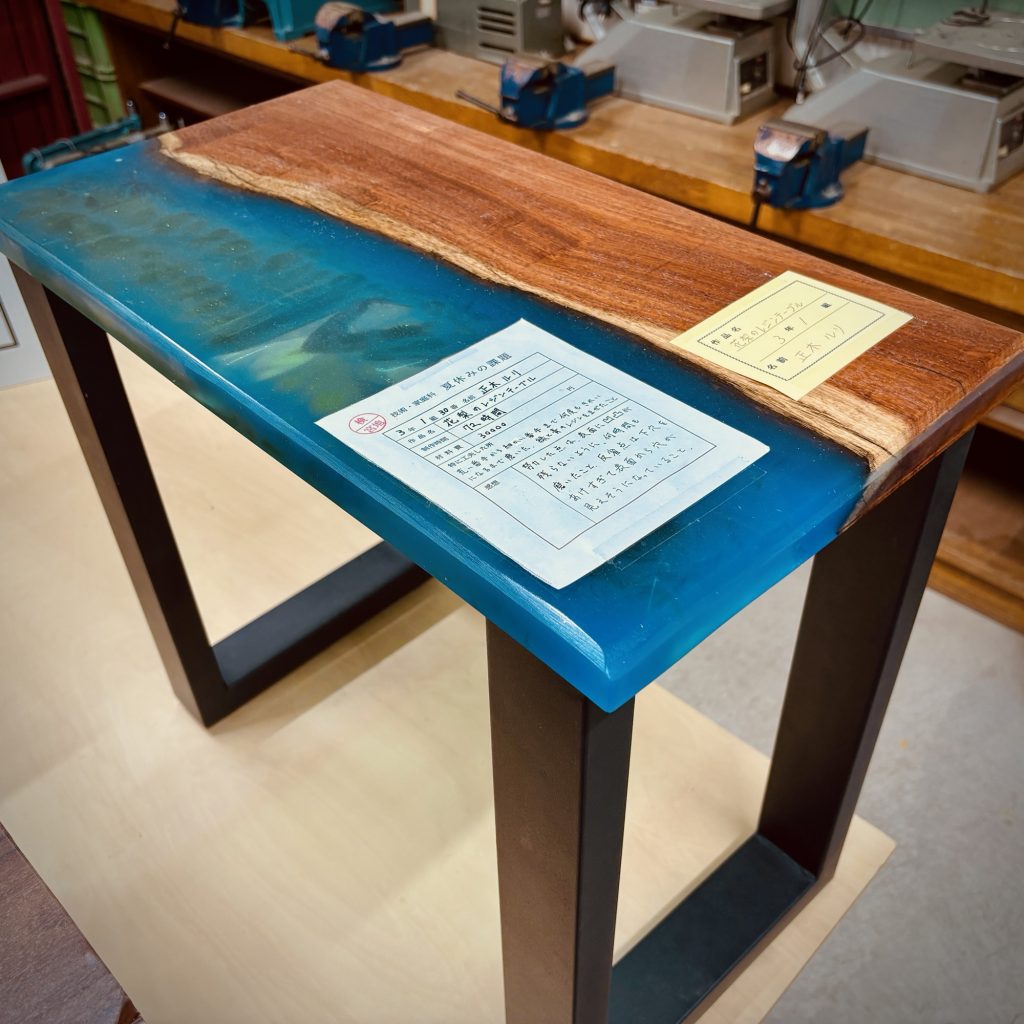 エコロキアのレジンテーブル制作体験ワークショップでは、初心者でも本格的な作品を作ることができます。今回、中学3年生が制作したサイドテーブルは、その象徴ともいえる素晴らしい出来栄えでした。