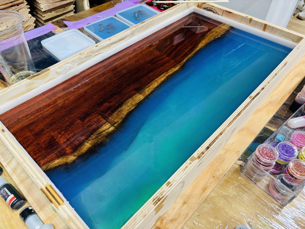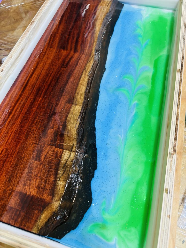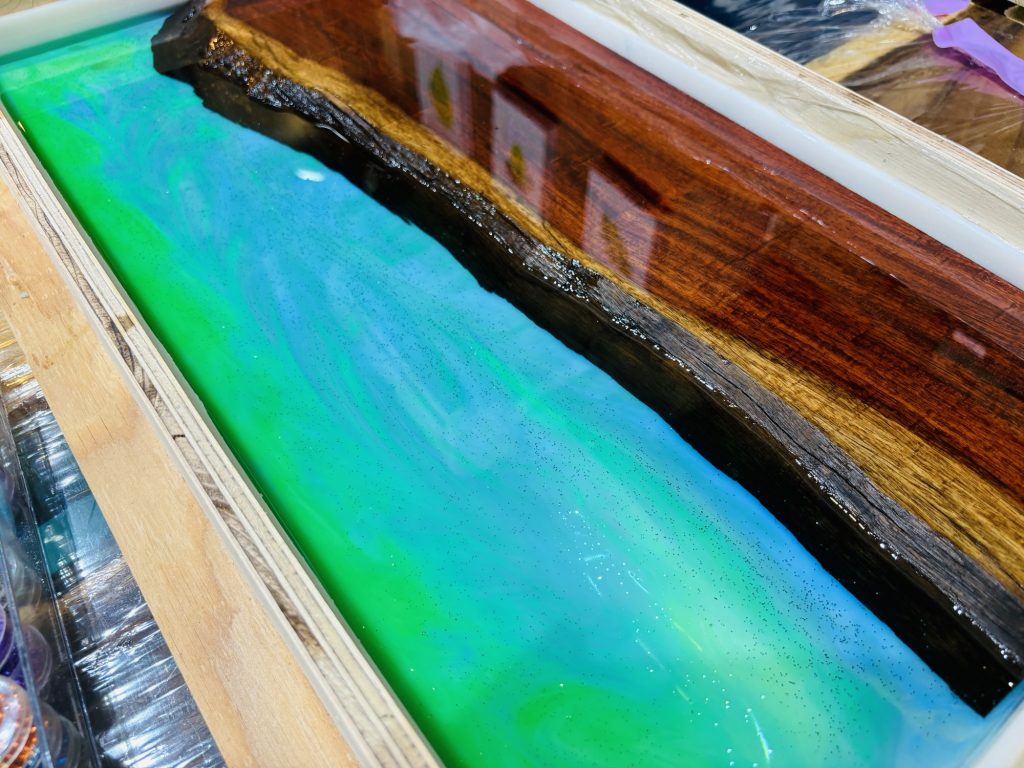 今回のサイドテーブルでは、花梨の半分に最初はブルーとそしてあとから明るいグリーンを融合させてレジンを流し込みました。