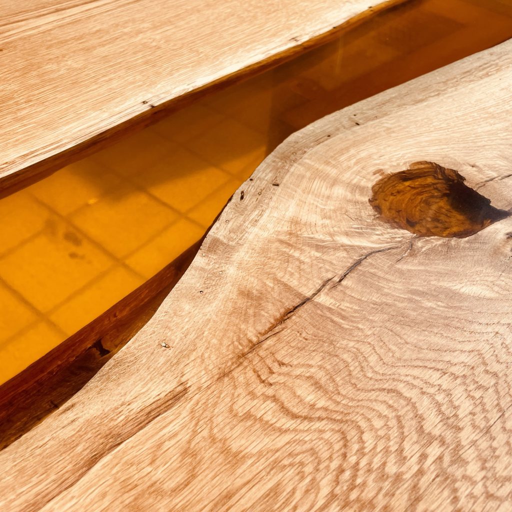 このホワイトオークの「時を重ねるごとに深みを増す特性」は、レジンテーブルにすることで新たな形で楽しむことができます。今回は、ウイスキーの持つ琥珀色をイメージしたレジンを組み合わせたレジンテーブルをご紹介します。