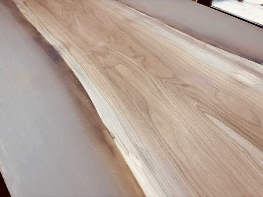 大きな胡桃の一枚板を中央に配置し、両サイドにレジンを流し込んだデザイン。