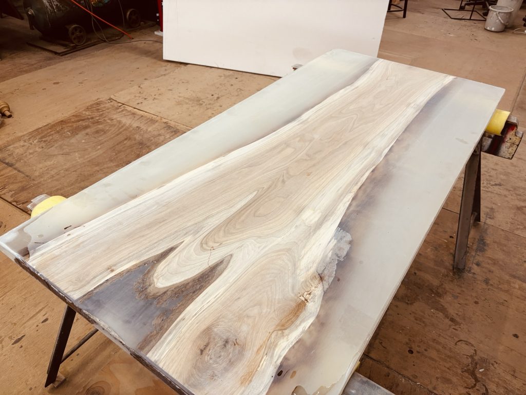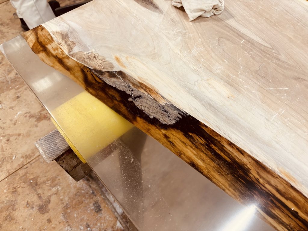 クルミの一枚板を中心に配置して両サイドにクリアを流し込んだレジンテーブルの制作体験ワークショップもついに第3回目。今回は、いよいよ研磨の工程に入りました!
