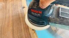 エコロキアでは、天然木とレジンを融合させた一点もののテーブルを製作しています。今回完成した新作は、オリーブの丸太を輪切りにしたパーツを中心に配置し、その周囲をアンバーカラーのレジンで包み込んだ、直径500mmのサイドテーブルです。