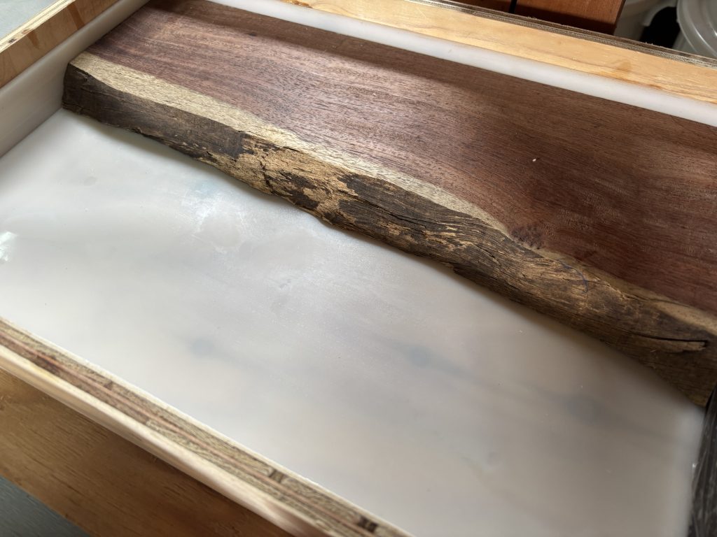 この間は何も手を加えず、ただただ静かに固まっていくのを待ちます。自然の力と化学反応が交差するこの時間は、まるで木とレジンが新たな命を宿す準備をしているかのようです。