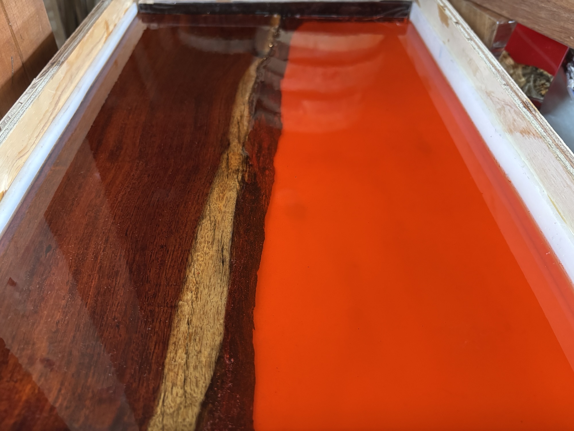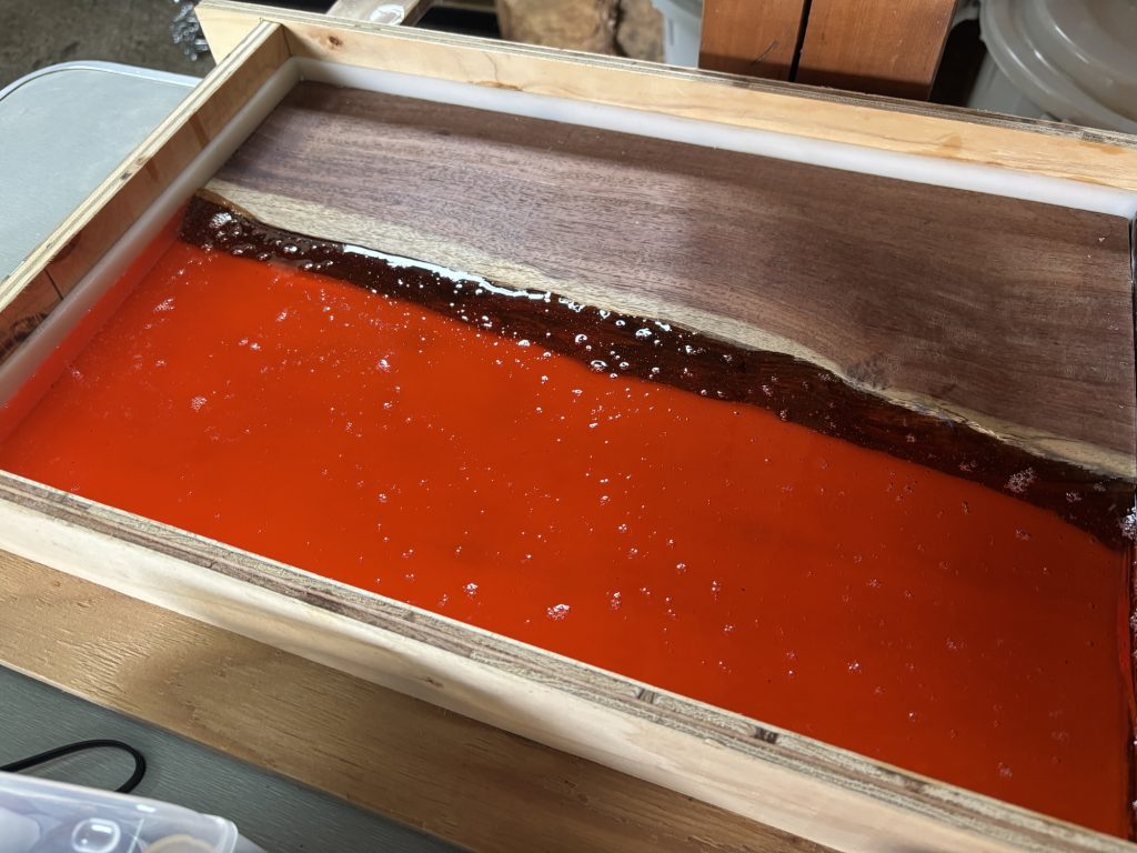 今回は鮮やかなオレンジ色のレジンを使用。透明度を活かしつつ、鮮やかに発色する顔料を調合し、いよいよ型枠へ注入。レジンを流し込む瞬間は、いつも心が静かになります。木の自然なカーブに沿って、オレンジのレジンがじわりと満たしていく光景は、まるで風景画が生まれるような感覚です。