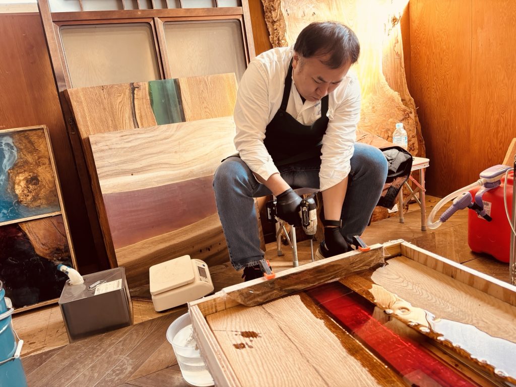 作業はまず、型枠の組み立てからスタート。しっかりと木材を固定し、レジンが漏れないようクランプで圧着していきます。その後、温度や粘度を管理しながらブルーとレッドのレジンを流し込み、ガスバーナーを使って気泡を除去。