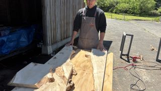 新店舗に置くための看板的なテーブルを自らの手で作りたいという想いから、はるばる奈良の工房までお越しくださいました。