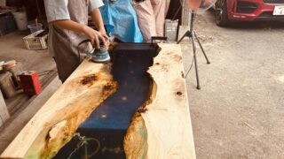 このあとは、硬化を経て粗削りの工程へと進みます。この工程では、サンダーを用いて表面をフラットにし、レジンと木の境界線をくっきりと際立たせていく作業を行います。