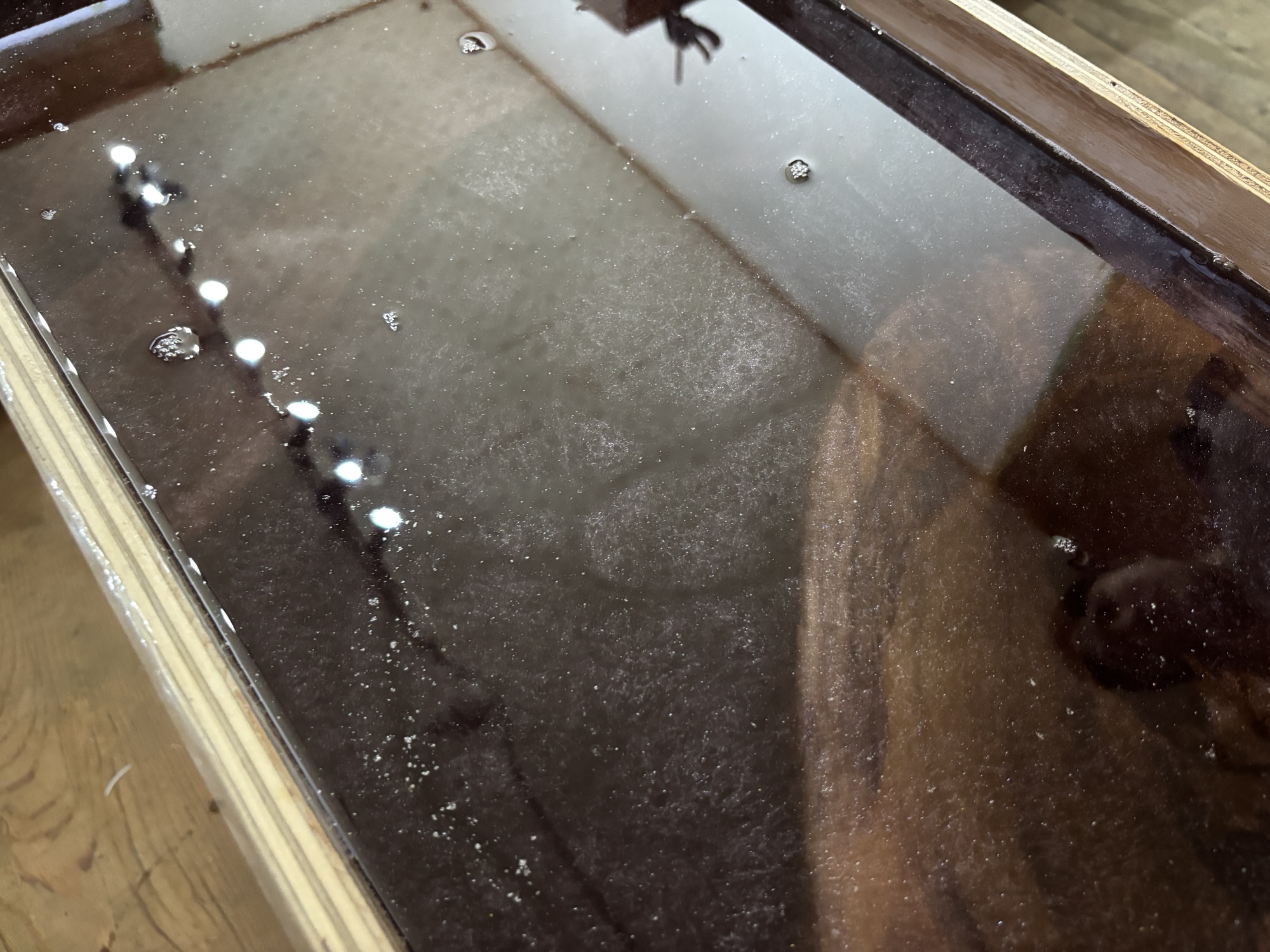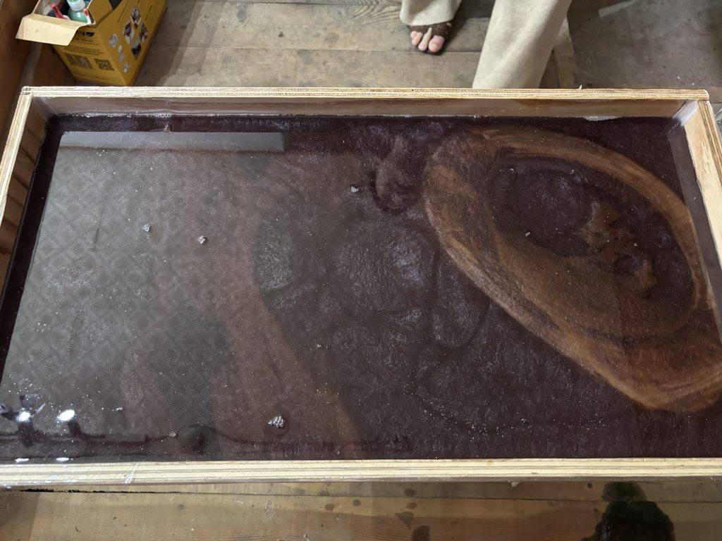 この作業はレジンテーブル制作においてとても重要で、後の仕上がりを左右するポイント。真剣なまなざしでスポイトを使い、木の表面にレジンを行き渡らせていく姿がとても印象的でした。