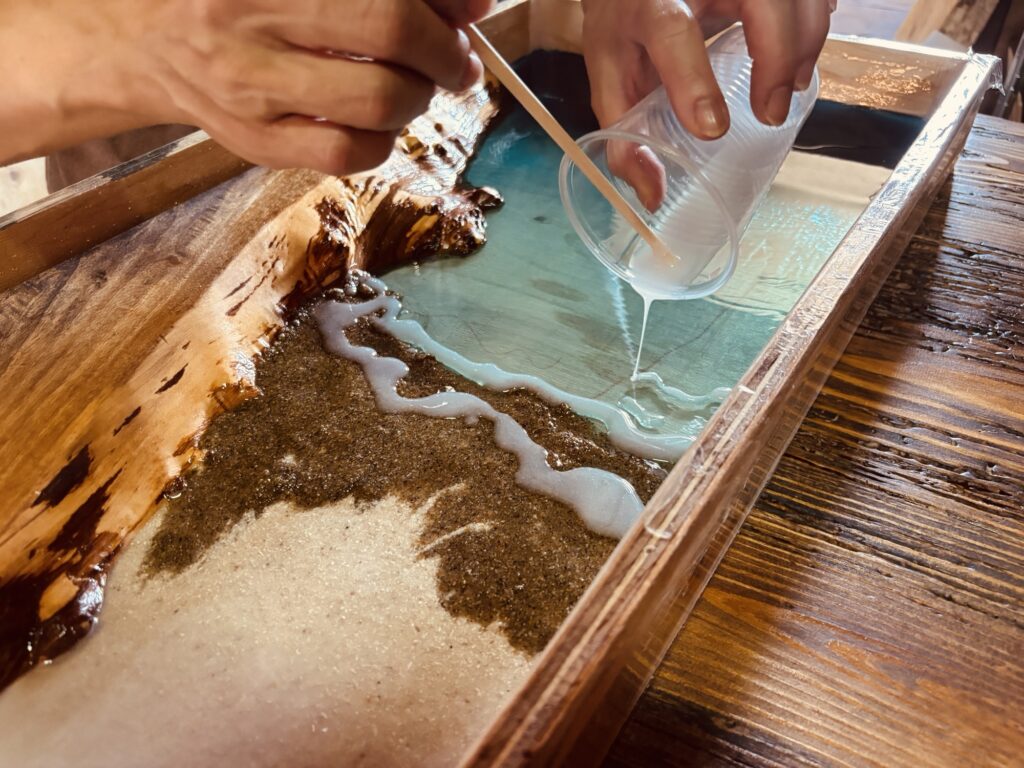 木材はすべて表情が異なり、レジンの流れ方も毎回違います。つまり、完成する作品は「世界にひとつだけ」のものです。参加者の方が「思っていた以上に感動した」とおっしゃるのは、手間をかけた分だけその作品が唯一無二の存在になるからです。