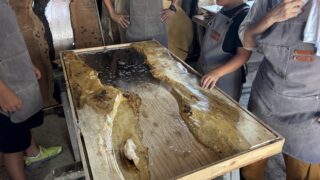 今回のワークショップでは、アフリカンブラックウッドとブルーレジンの力強い作品、そしてポプラ材とグラデーションレジンによる柔らかな作品が生まれました。どちらも、作り手の個性と努力が詰まった世界に一つだけのテーブルです。