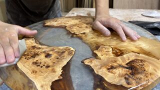 ポプラとレジンが織りなす世界にひとつだけのラウンドテーブル完成!最終仕上げの工程に密着