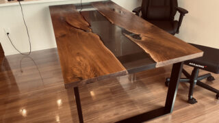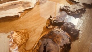 木目とレジンが自然に溶け合い、人工物でありながら有機的な表情を持つ――それがレジンテーブルの最大の魅力です。
