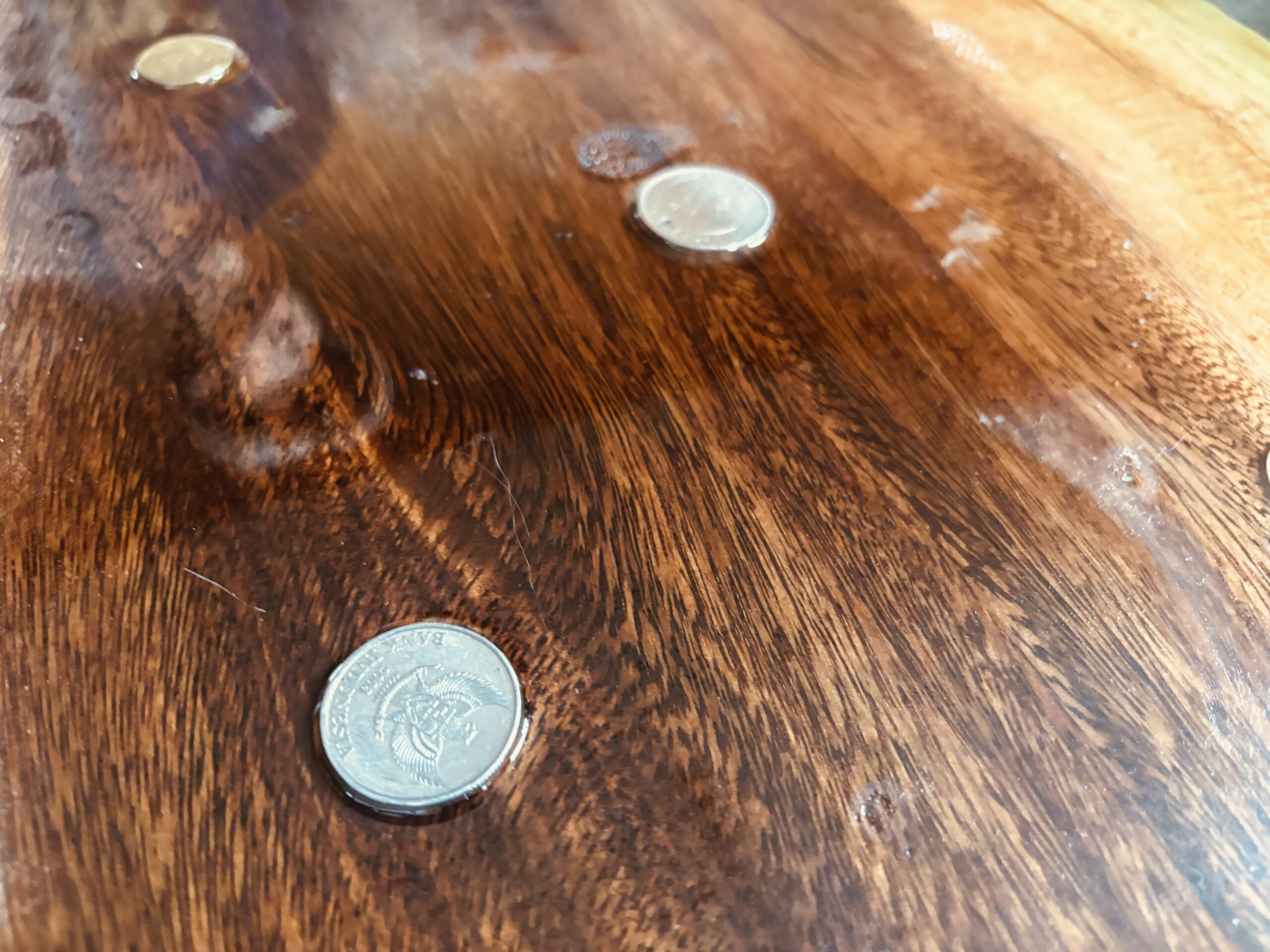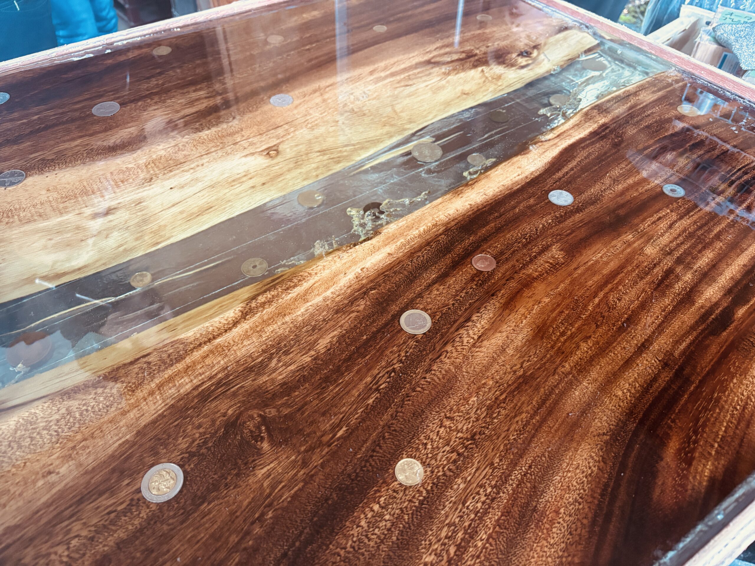 古銭や海外のコインを埋め込み、モンキーポッドの深い杢目と淡いグリーンのレジンが幻想的な表情を見せています。