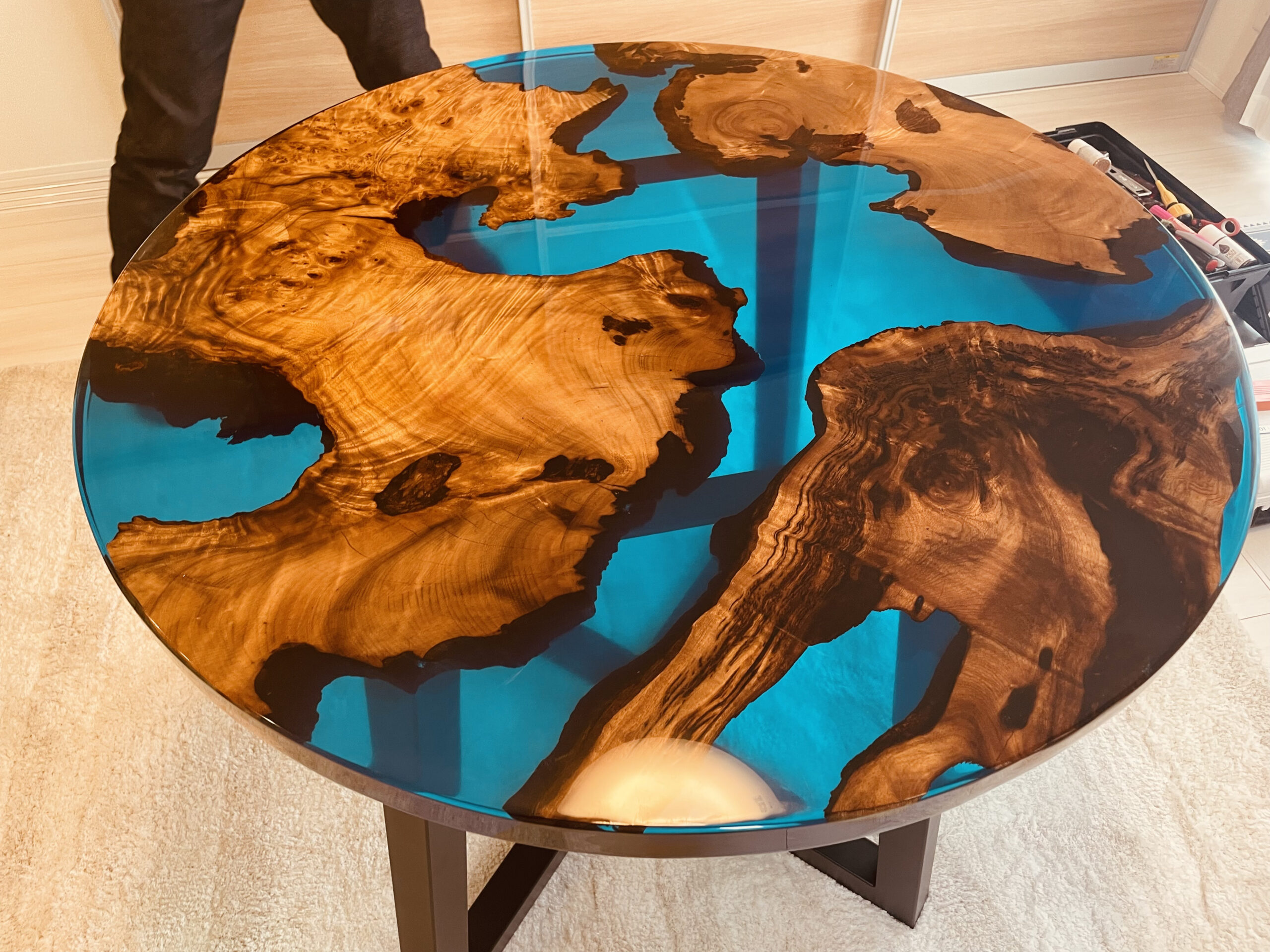 千葉県流山市へ納品したカンファーウッド×ブルーレジンテーブルの全貌