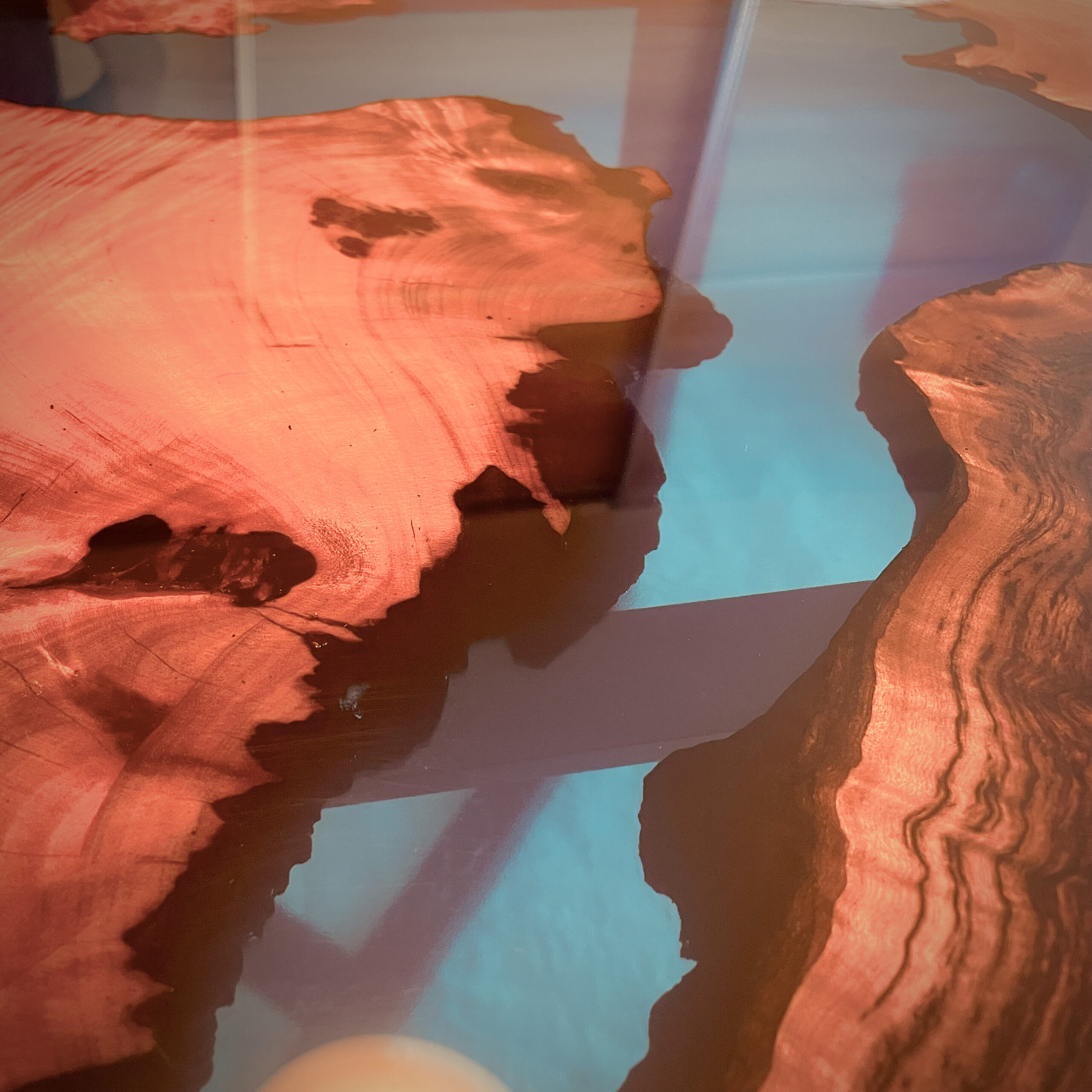 レジンテーブルの制作では、この自然の造形をいかに美しく見せるかが大切で、ブルーレジンの透明感と掛け合わせることで、木目の奥行きや質感がより鮮明に浮かび上がります。今回の作品でも、瘤の立体的な模様が光に照らされてまるで“地球の地殻変動”のように見え、レジンの青が“海域”として広がることで壮大な世界観を生み出しています。単なる家具という枠を超え、空間にアートを飾るような価値を持つのが、瘤材×レジンの組み合わせなのです。