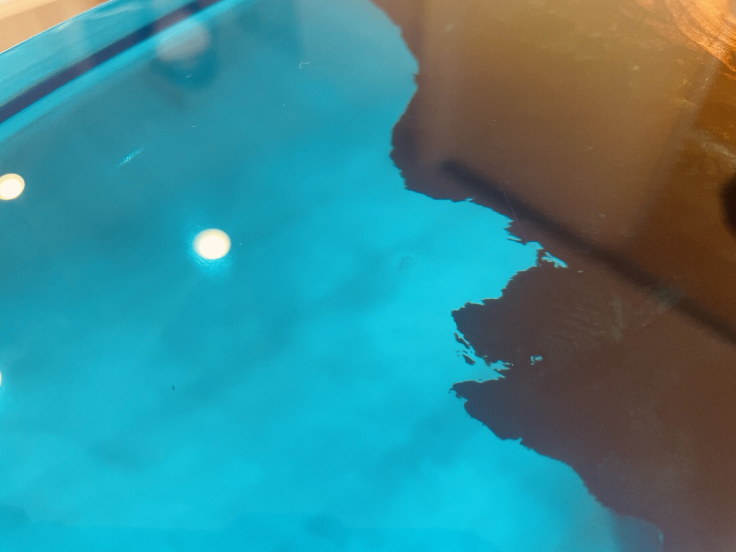 今回の作品でも、ブルーレジンの内部まで鮮明に見える研磨が施され、まるでガラスのような光沢を実現しました。鏡面仕上げは見た目の美しさだけでなく、汚れにくさやメンテナンス性にも優れており、長く快適に使えるレジンテーブルとしての価値を高めています。