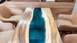 レジンテーブルの制作では木材の割れや節をどう生かすかが重要ですが、カイヅカイブキは独特の湾曲した木目が美しく、レジンと組み合わせることで水辺の風景のような世界観が生まれます。今回はその魅力を最大限に引き出すため、ブルーグリーンのレジンを流し込み、海のような深い色を演出しています。
