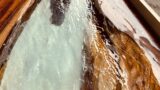 今回使用した材も、自然が生み出した曲線が特徴的で、入江のラインを削り出す際にその個性が非常に活きました。丸太そのものの表情を残しながらレジンと融合させることで、市販の均一な素材では出せない“自然の風景”としてのテーブルが完成します。
