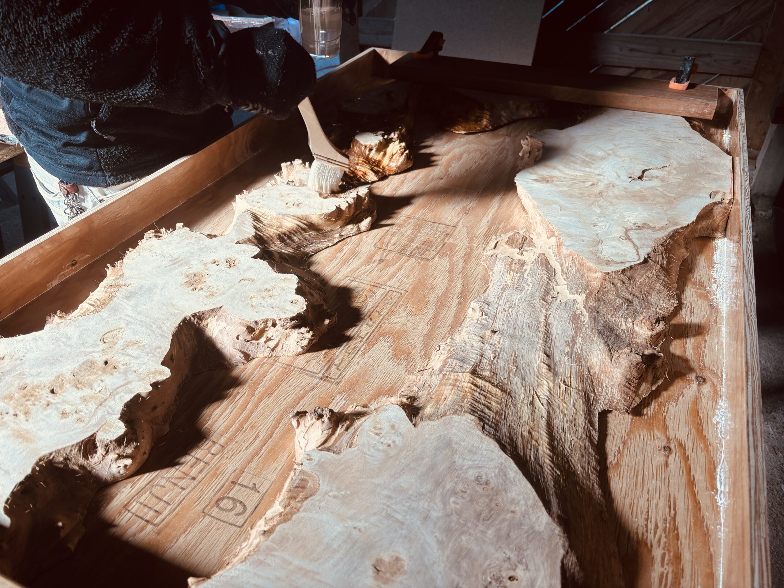今回使用したポプラ材は、非常に個性的なコブと複雑なうねりを持つ、まさに“表情の豊かさが特徴”の素材です。ポプラはレジンテーブルとの相性が良く、自然がつくり出した地形のような凹凸がレジンによって際立ち、唯一無二の作品に仕上がっていきます。