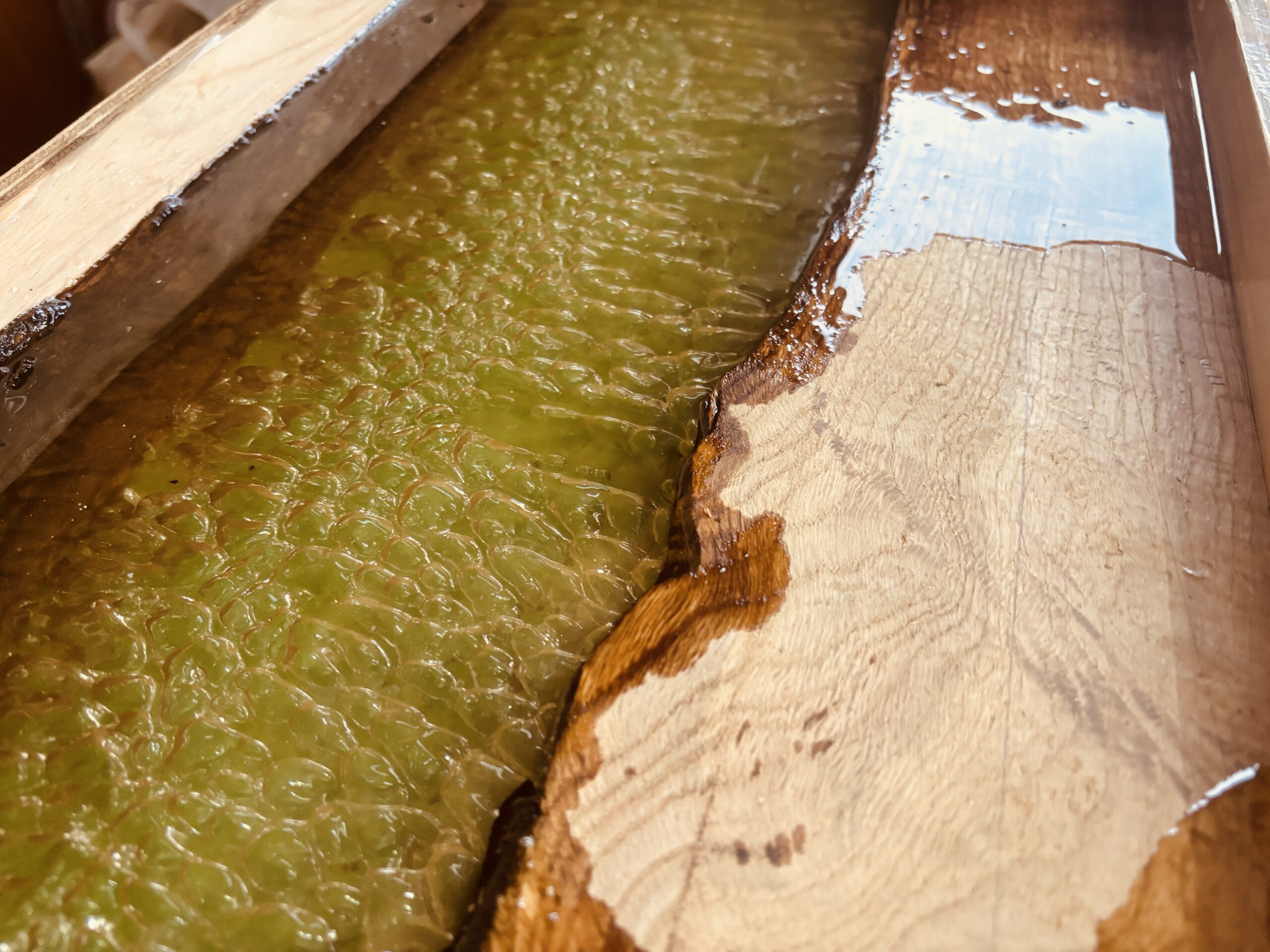 レジンテーブルづくりの面白さは、技術だけではどうにもならない“偶然”が作品の魅力を左右するところにあります。泡の大きさ、位置、光の入り方……すべてがそのときにしか生まれない表現で、二度と同じ模様を再現することはできません。