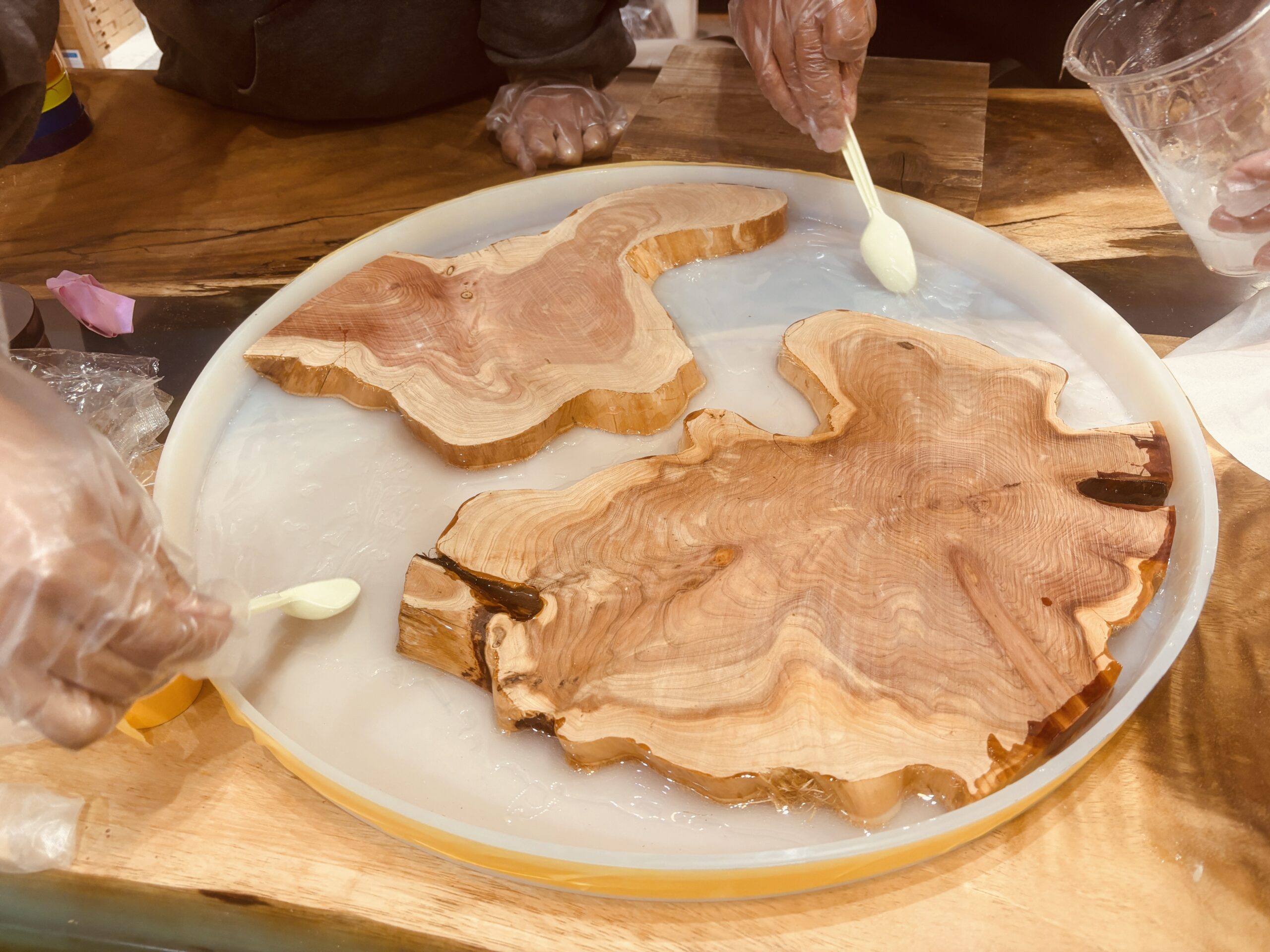 こうした個性的な素材との出会いも、レジンテーブル制作体験の醍醐味のひとつです。参加者の多くは木材の状態を見た瞬間に直感で「これが好き」と言われることが多く、自分の感性に響く木材を選ぶことで、作品への愛着もより深まっていきます。