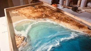 レジンテーブル制作体験ワークショップでは、今回のようなサイズ感や工程を実際に体験することができます。完成品を購入するだけでは分からない、素材の扱い方や色の選び方、仕上げの大切さを体感できるのが魅力です。テーブルとして使うだけでなく、アートとして空間を彩る作品を自分の手で作る。その体験こそが、エコロキアが大切にしている価値です。