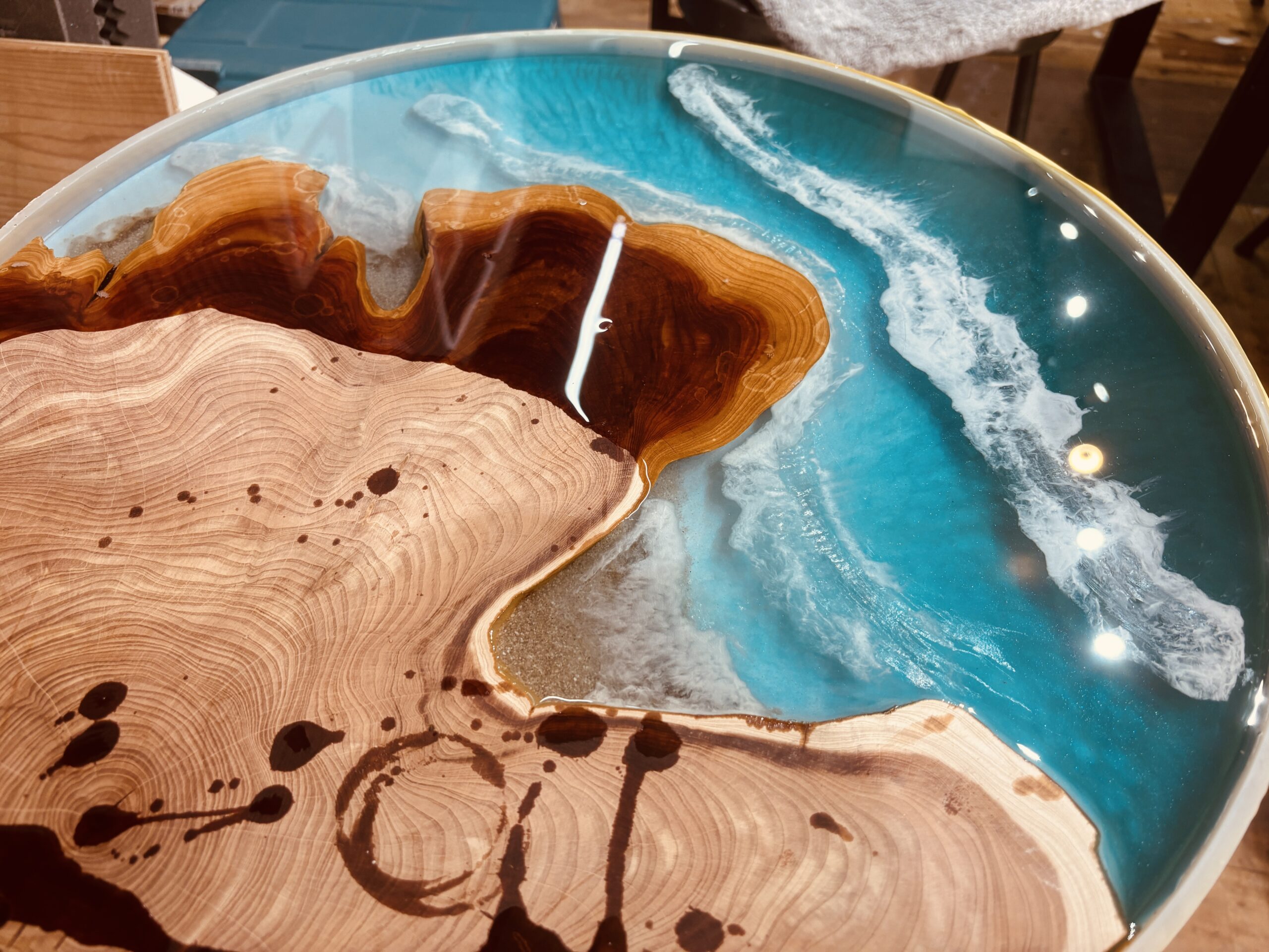 今回のレジンテーブルでは、これまでエコロキアで行ってきた波表現に、あえてひと手間を加えています。それが「ベースのレジンが完全に硬化する直前」に、波のラインとなる部分をわずかに凹ませる工程です。