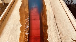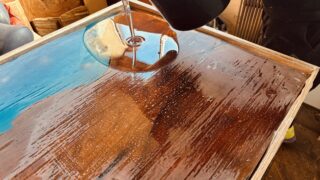 作業台の上で仕上げ前のトチノキのレジンテーブル全体を確認している様子。