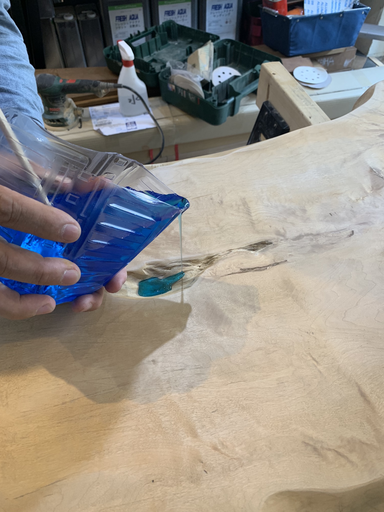 トチノキの割れ部分にブルーのレジンを少量ずつ流し込んでいる工程写真。