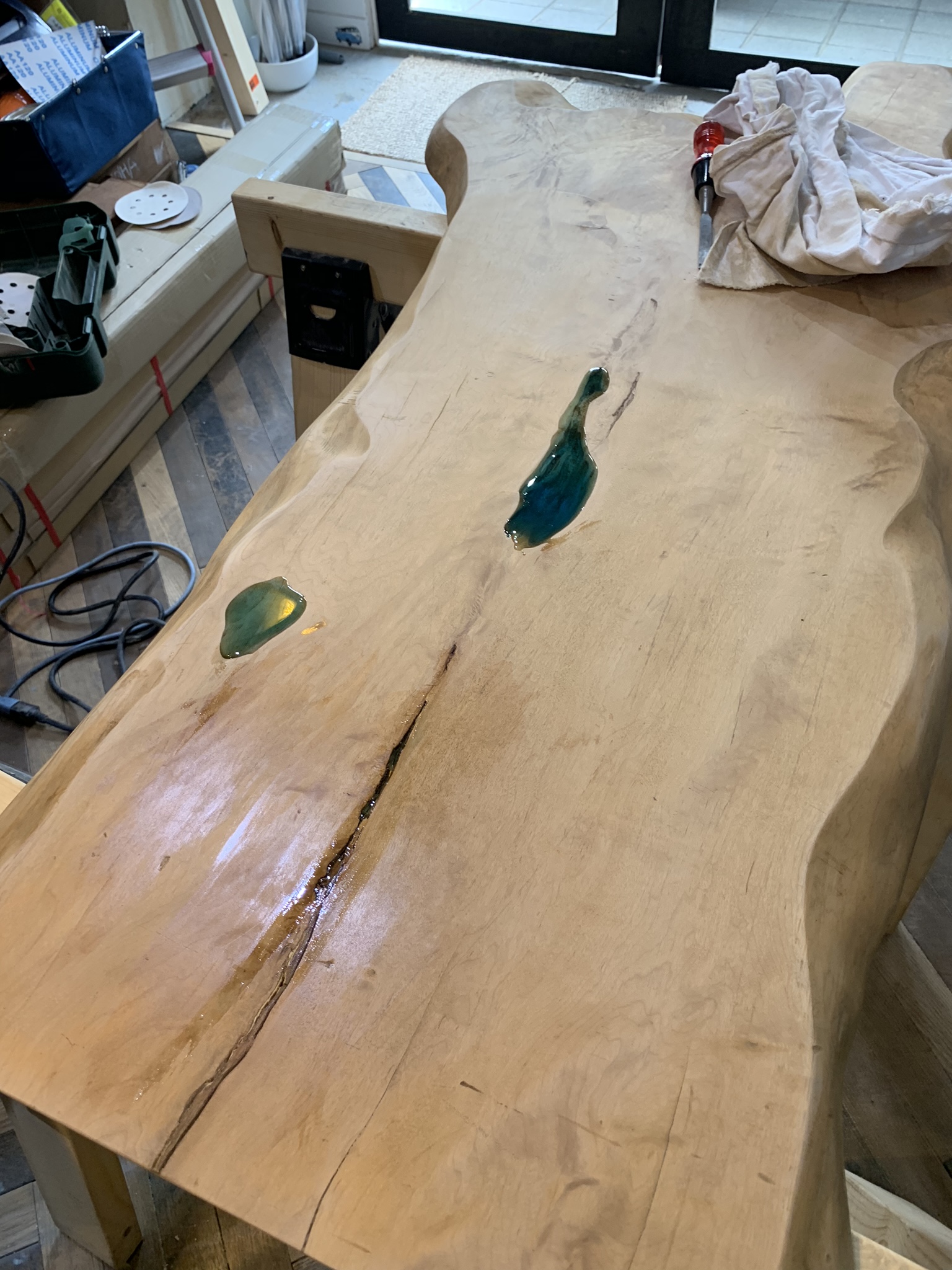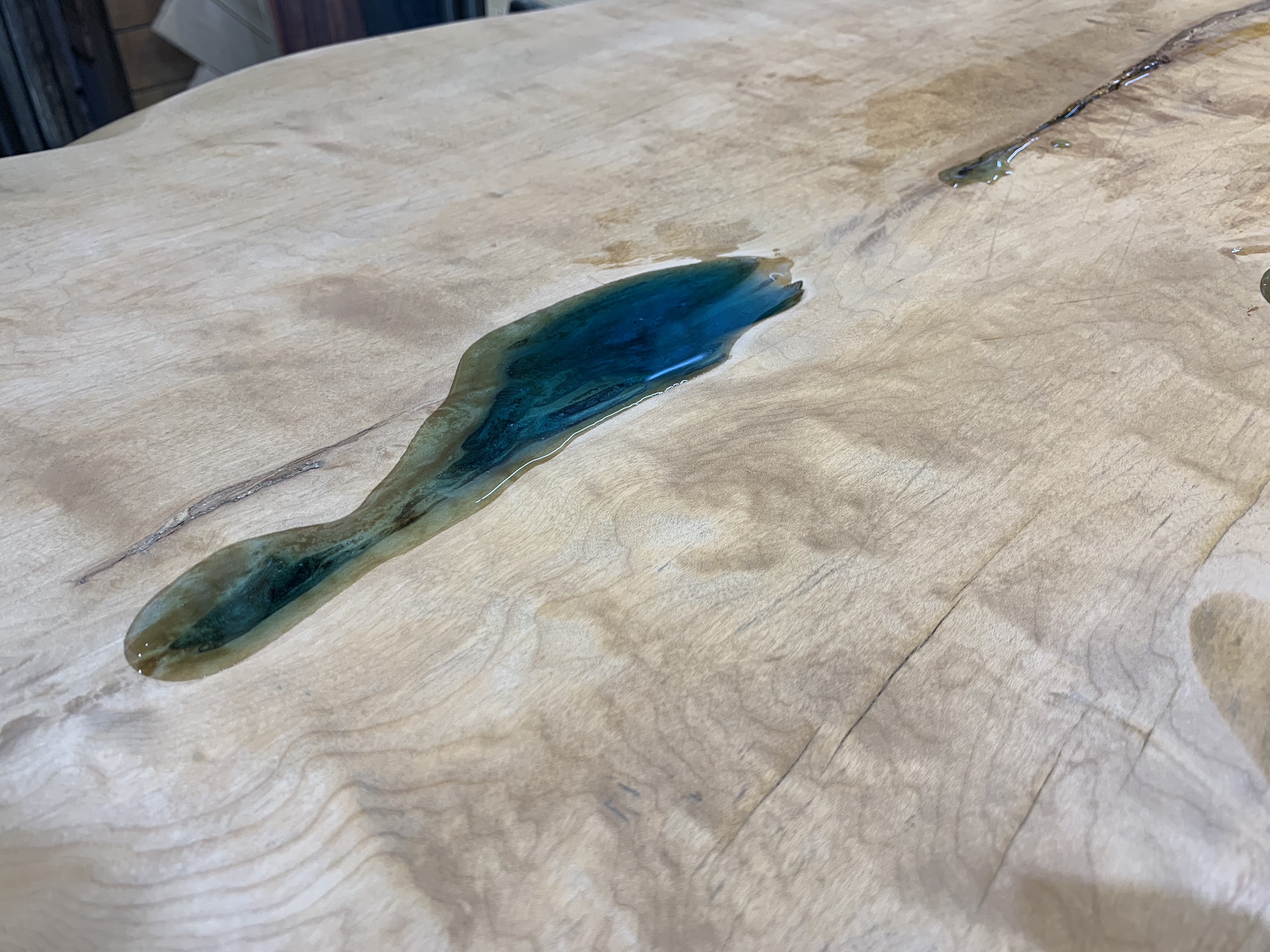 トチノキの割れとくぼみにブルーのレジンが溜まり、まだ硬化前の状態。