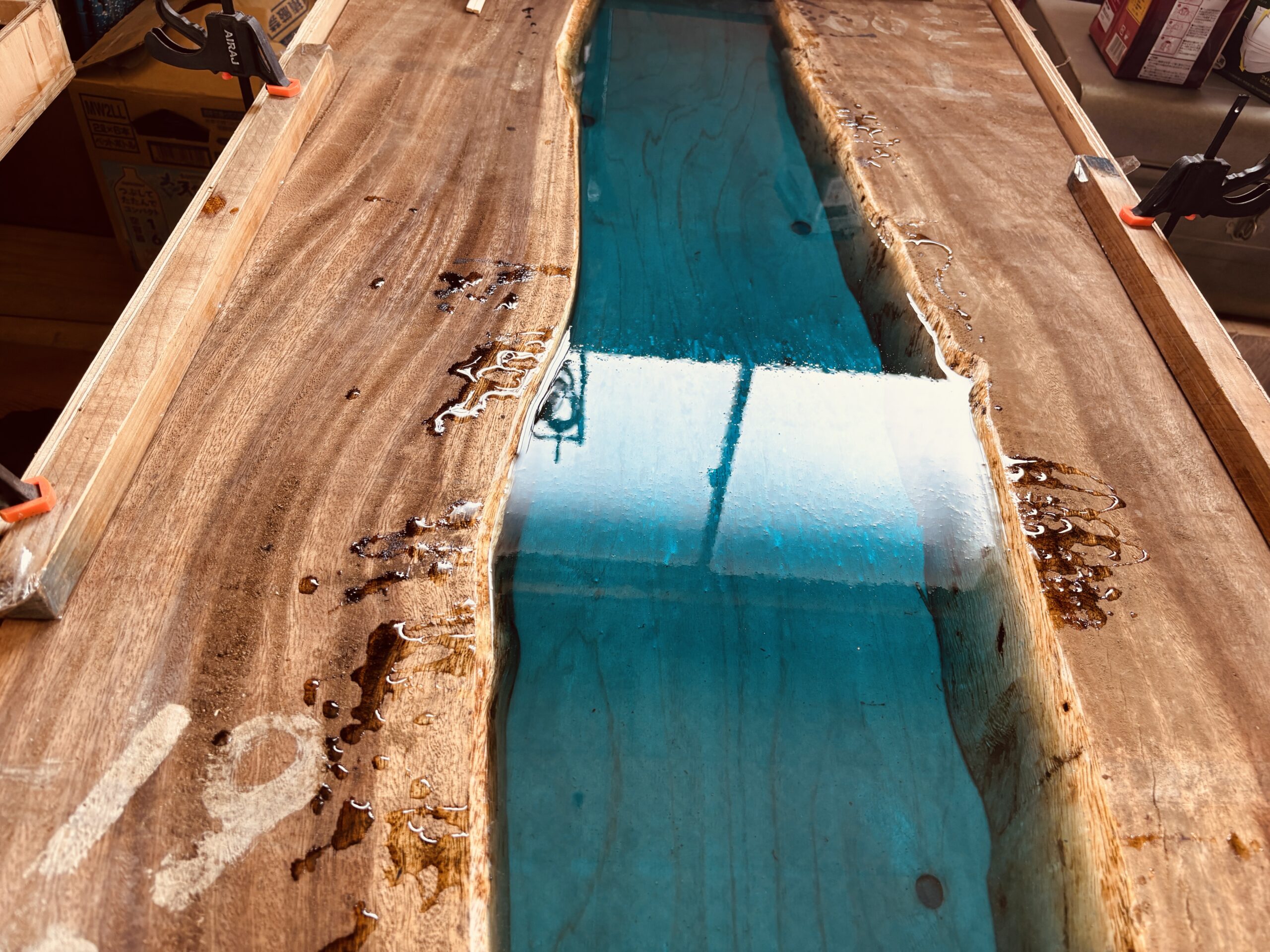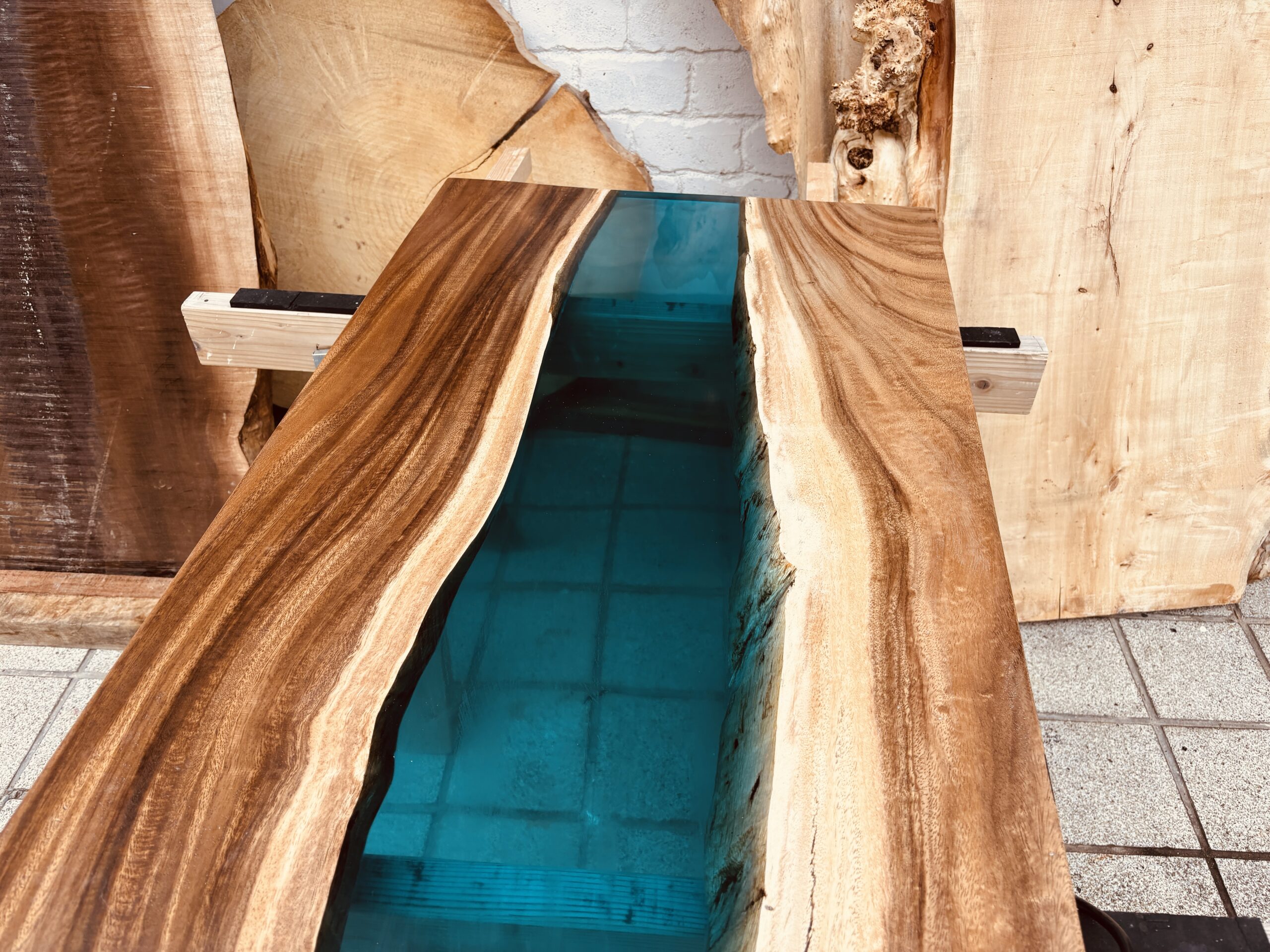 荒々しい木目のモンキーポッドに、透明感のあるアクアブルーのレジンを組み合わせることで、静と動の対比が生まれます。