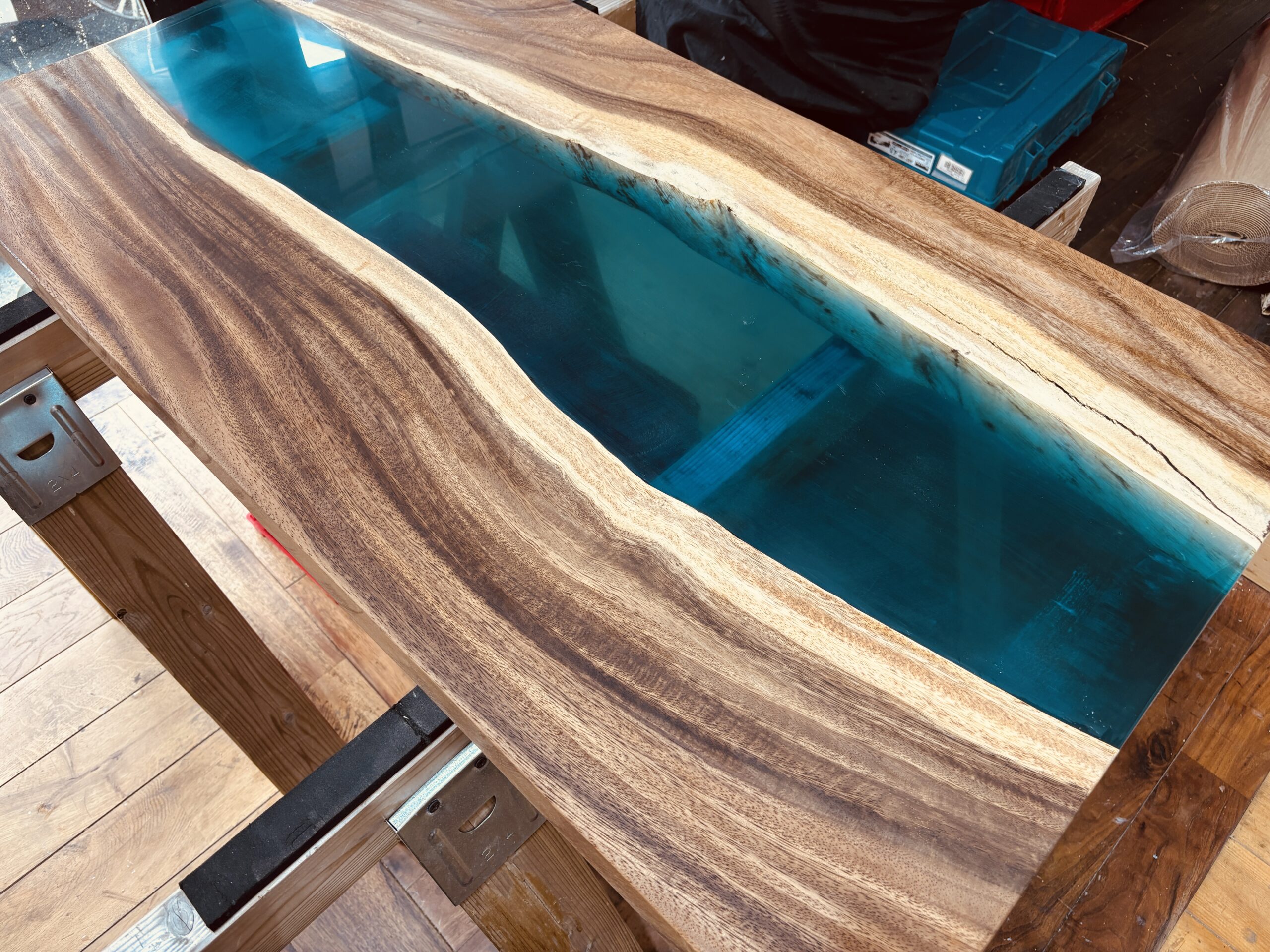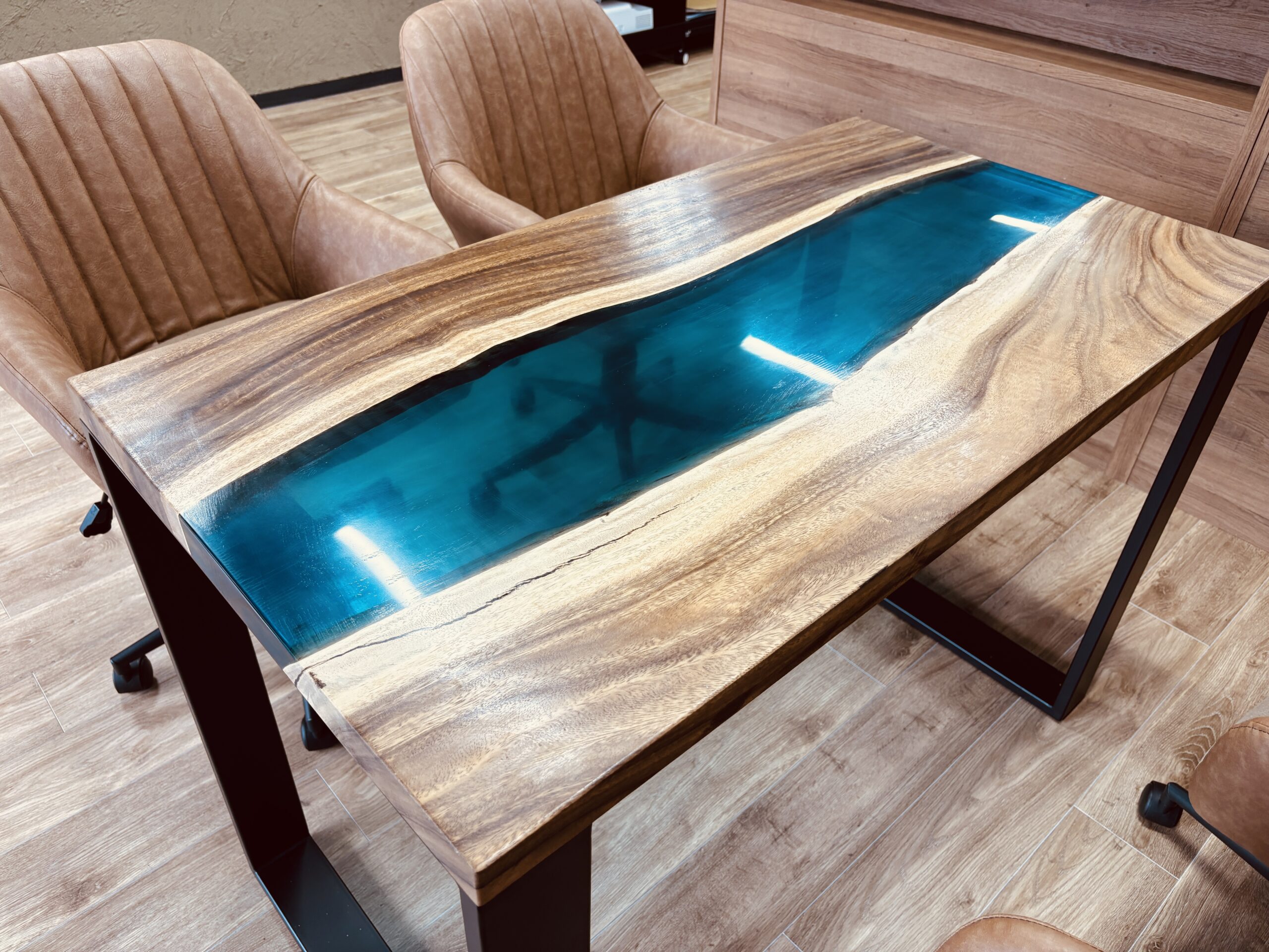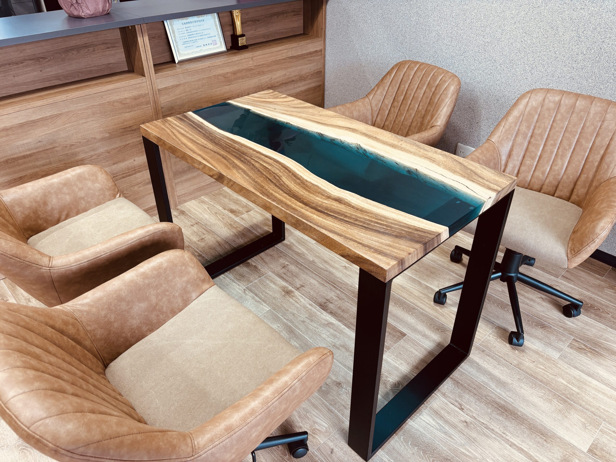 企業の姿勢や価値観が無意識に伝わる空間です。今回納品したモンキーポッド×アクアブルーのレジンテーブルは、奥行600mm、幅1100mmという扱いやすいサイズでありながら、視線を一瞬で引きつける存在感を持っています。