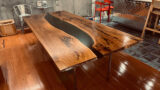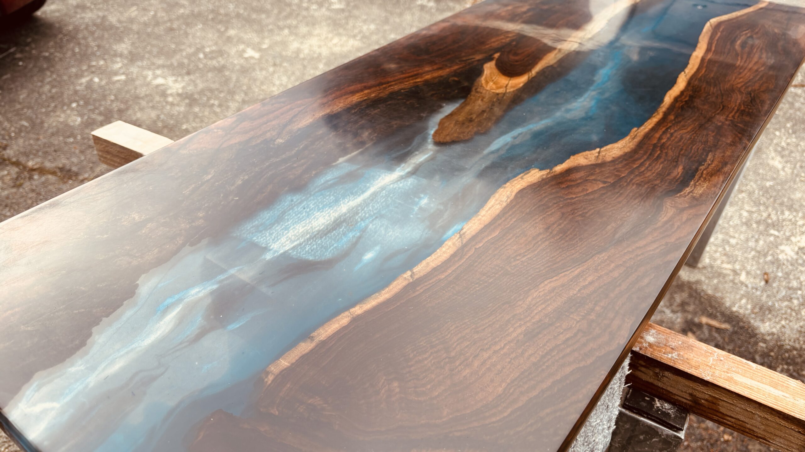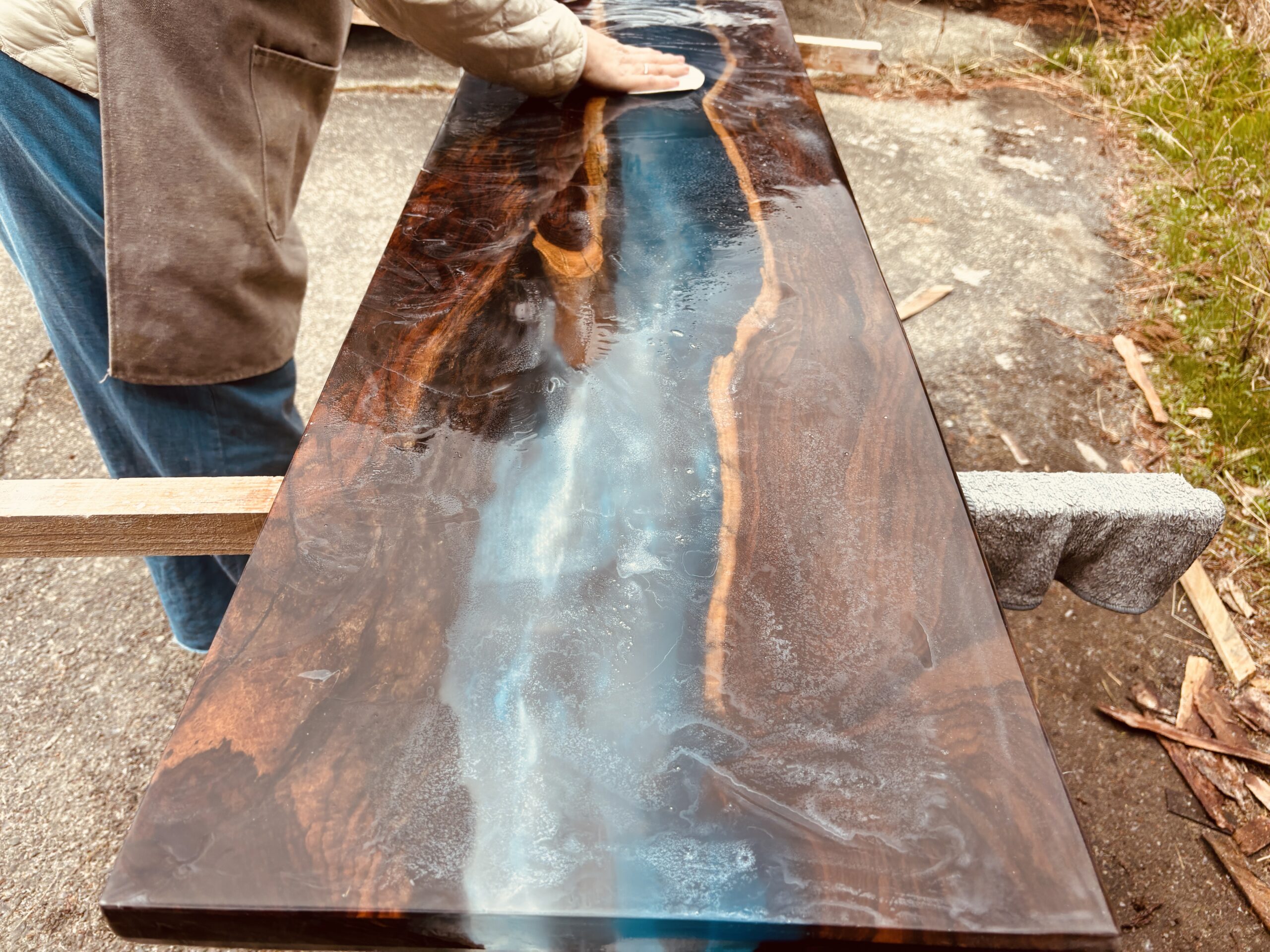 今回の参加者様は、荒研磨、中間研磨、そして水研磨まで丁寧に工程を進め、天板表面の透明感を最大限まで引き出しました。曇っていたレジンの内部が、削るたびに澄み渡り、閉じ込めたブルーの層と無垢材の杢目が立体的に浮かび上がります。