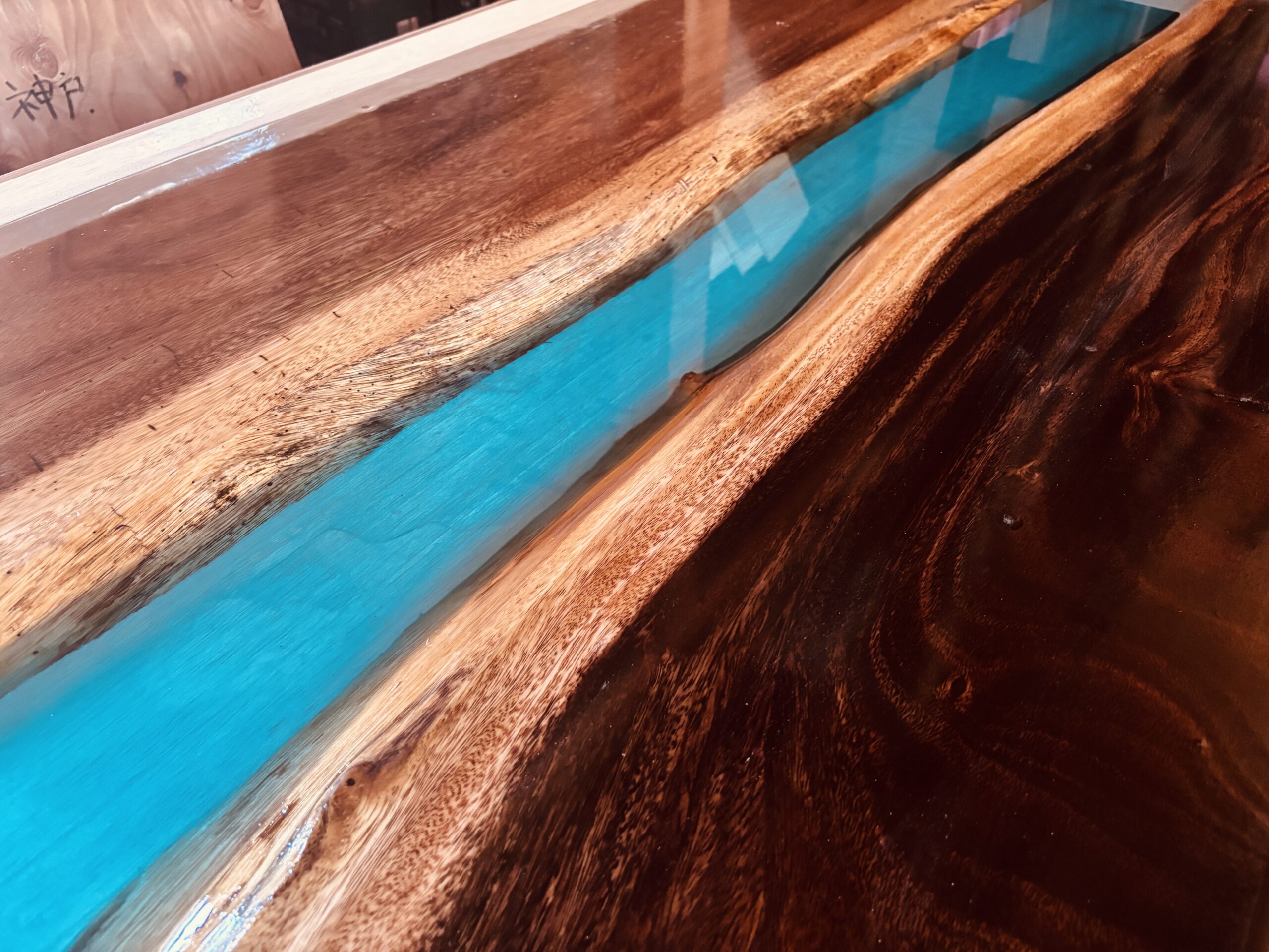 フルオーダーでご発注頂きましたモンキーポッド×アクアブルーのレジンテーブルが間もなく完成します。レジンテーブルをご検討のお客様からよく頂くご質問のひとつが、